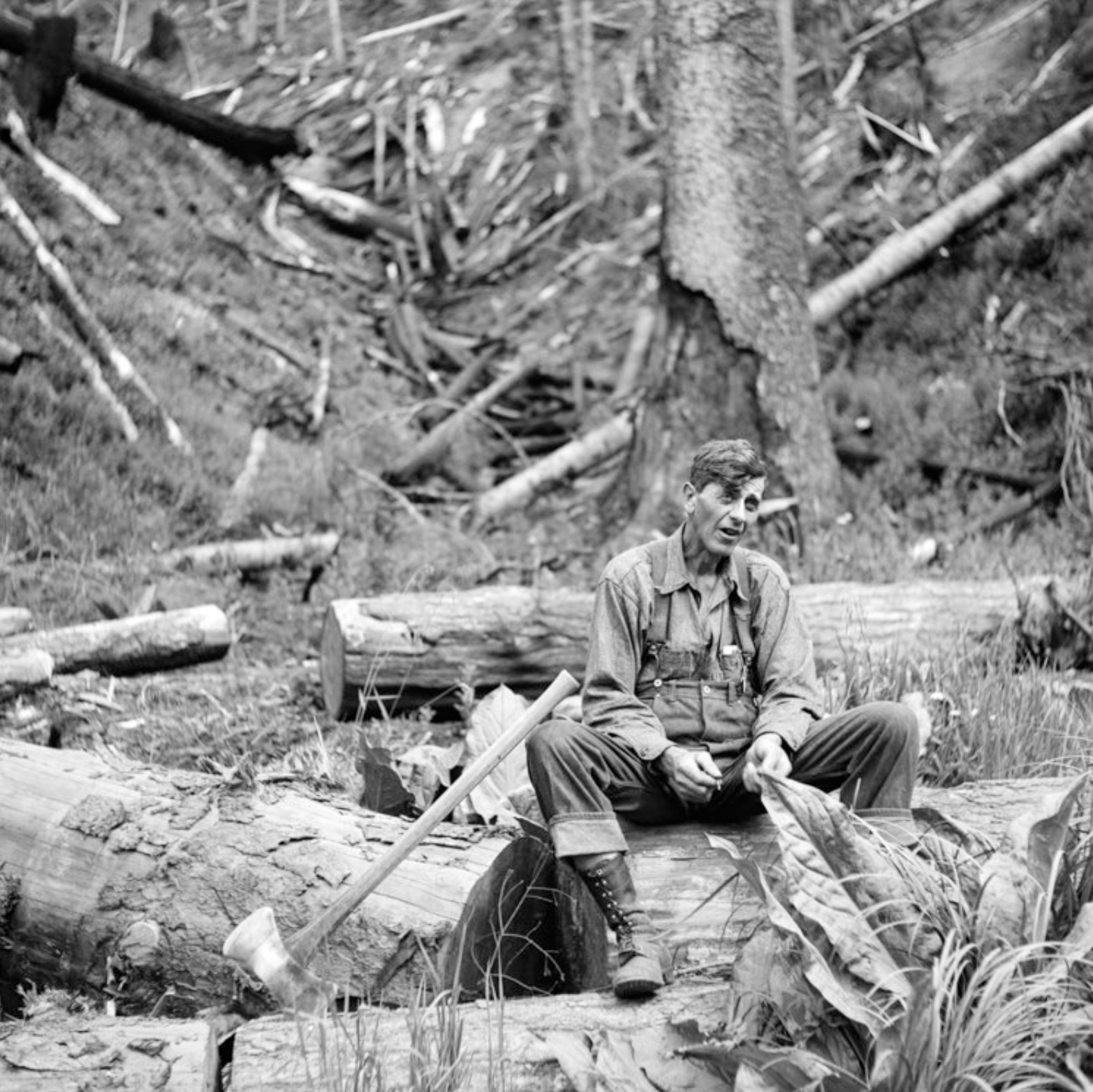 This farmer was hard at work chopping down trees and removing skunk cabbage and ferns as he attempted to clear an abandoned homestead.